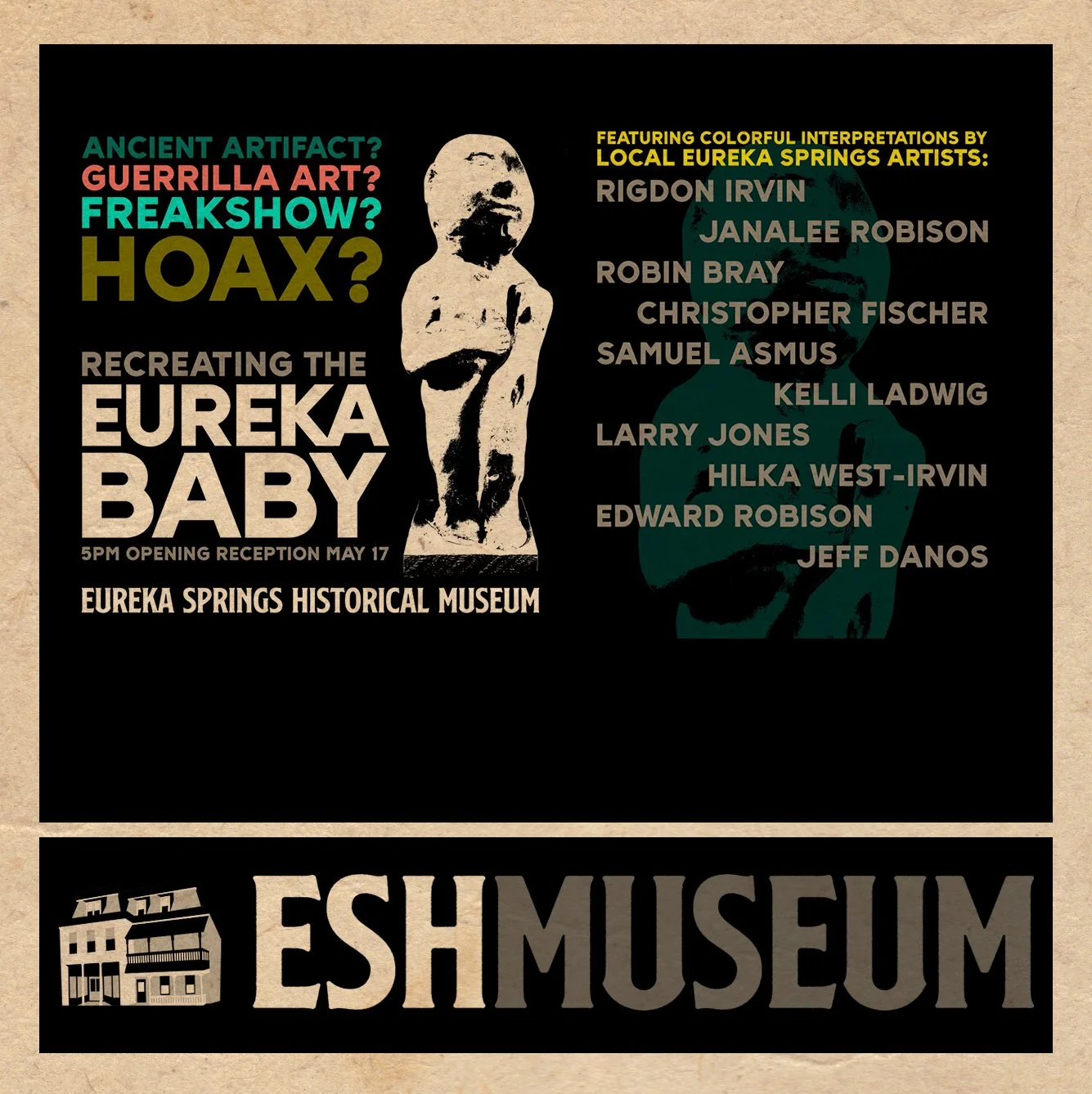 Be sure to check out the new ESHM exhibit: “Recreating the EUREKA BABY”. This exhibit chronicles the long fabled story of “Baby Eureka” – is it an ancient artifact, gorilla artwork, freakshow or a hoax? A group of local artists will add some “color” to the story as they interpret their recreation of “Baby Eureka”. Opening Reception May 17 at 5pm $5 Admission, Free for Museum Members. More information can be found HERE.