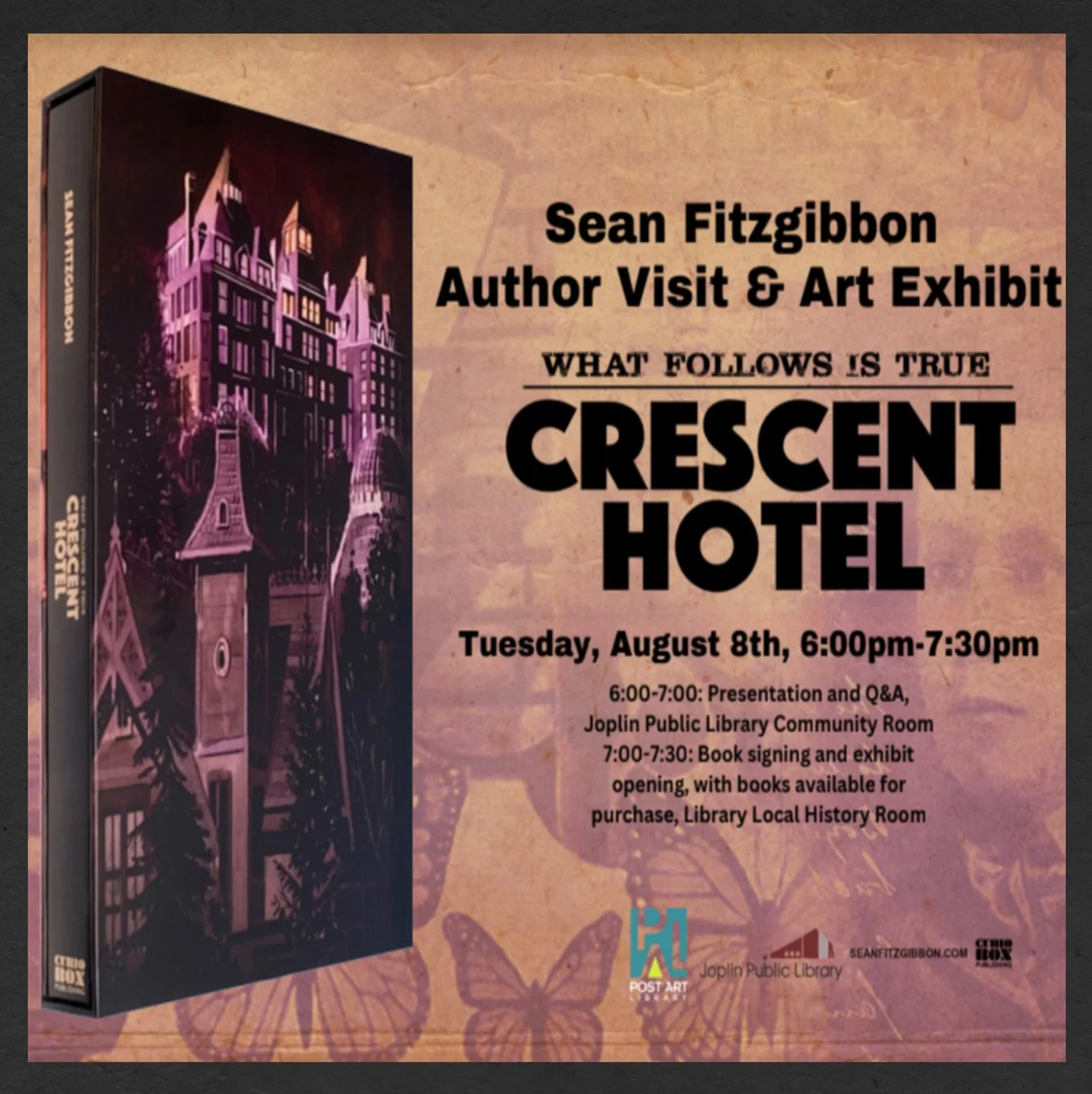Join us for an author event at Joplin Public Library. I'll be discussing not only my book but also the process of creating a graphic nonfiction and how I became interested in telling stories visually. If you're interested in visual narrative and the very strange history of the Crescent Hotel then I hope to see you at the author event on Tuesday!