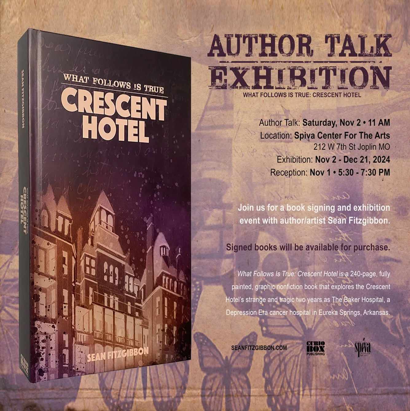 Sean is an artist/graphic novelist known for his work “What Follows Is True: Crescent Hotel”. His illustrated novel is a documentary-style graphic nonfiction book that explores the Crescent Hotel’s strange two years as the Baker Hospital.